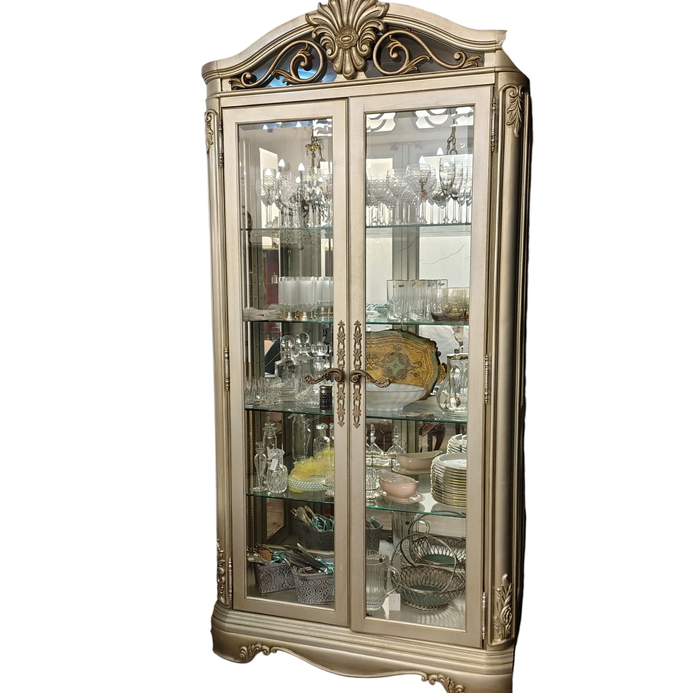 Ornate Display Cabinet with Glass Doors and Carved Pediment